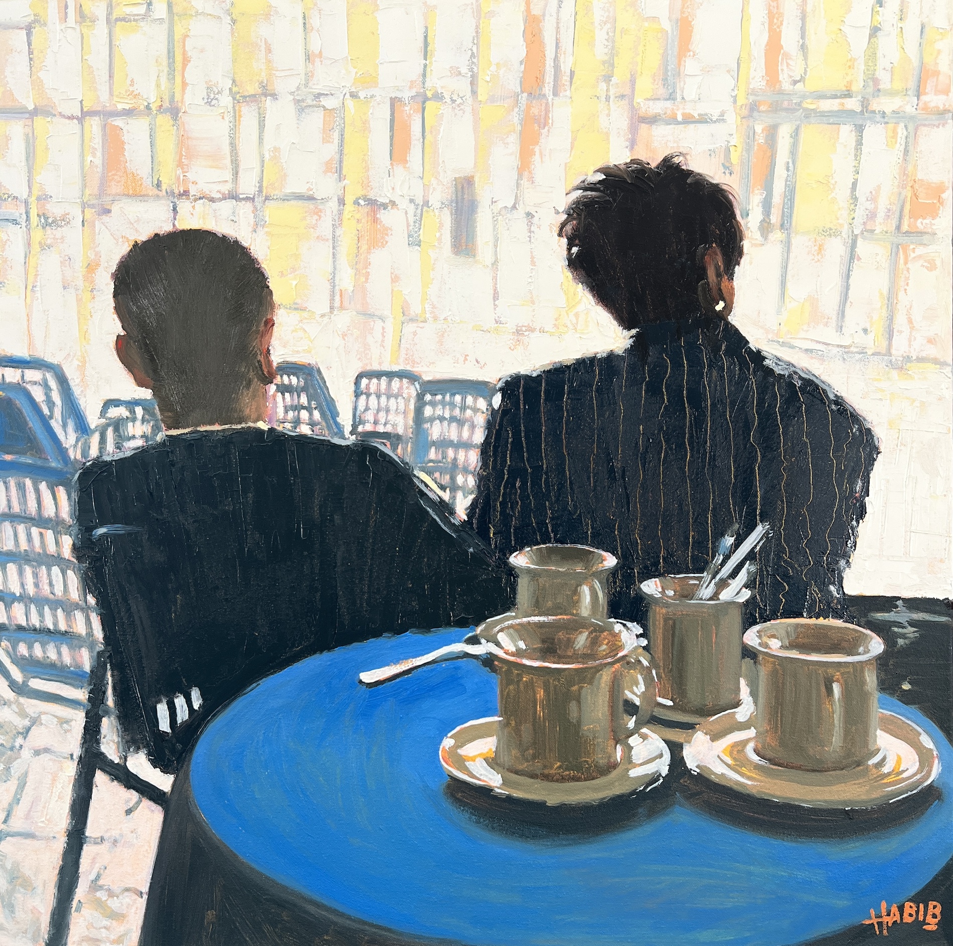 A couple takes a break from a leisurely coffee to enjoy the sights on the Piazza del Campo in Siena, Italy.