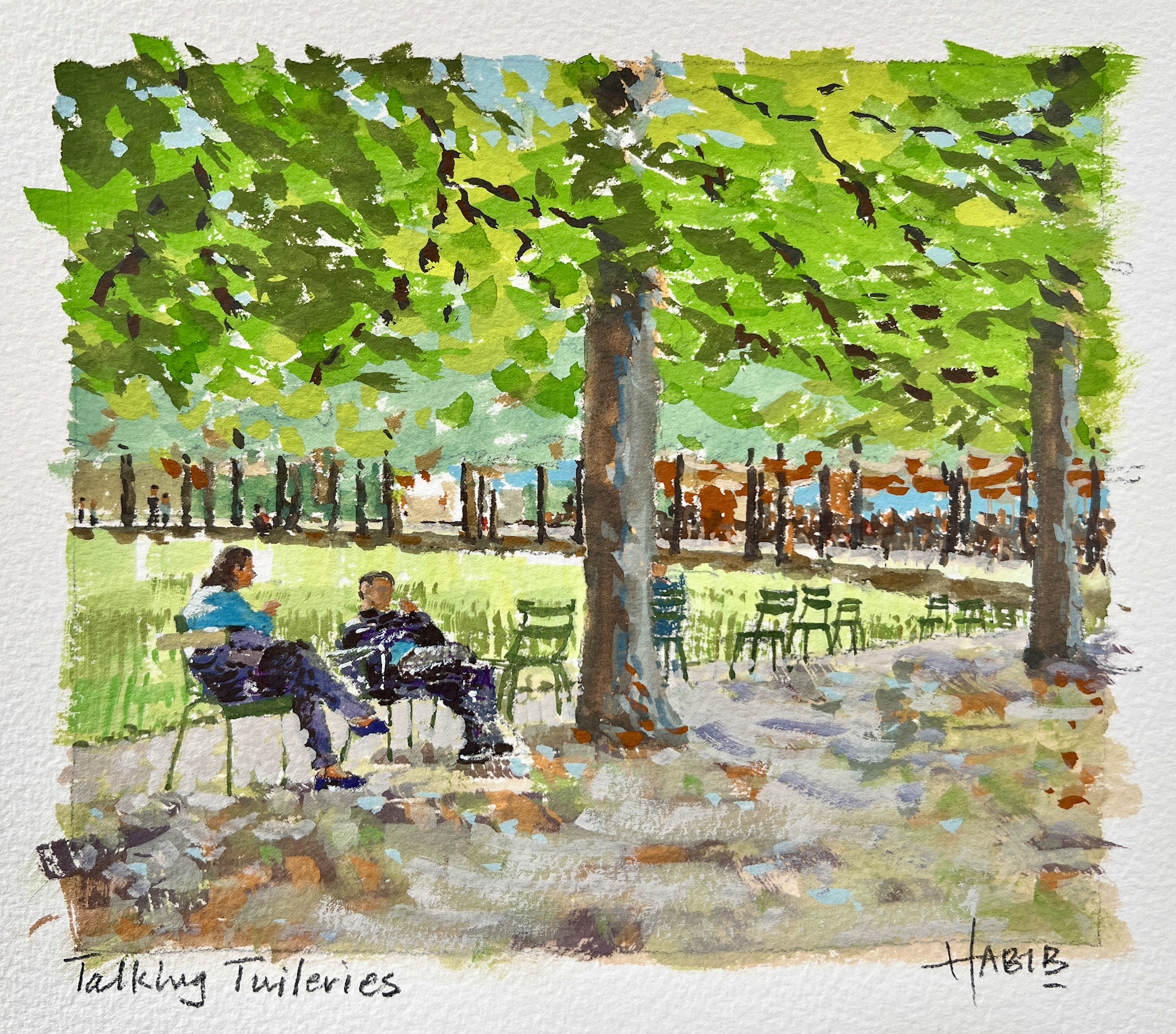 A couple discuss the issues of the day in the Jardin des Tuileries along the East Bank in Paris.